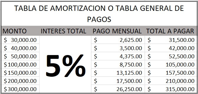 Los montos aquí descritos y estipulados en la tabla anterior están estimados a un plazo de un año con la tasa anual y fija marcada en la imagen, ninguno de los montos esta excepto de intereses moratorios o cargos por pagos extraordinarios, no se realiza ninguna modificación a ninguna de las líneas de crédito por ningún motivo sin un aviso previo de al menos 15 días hábiles al titular y su especifica aprobación.